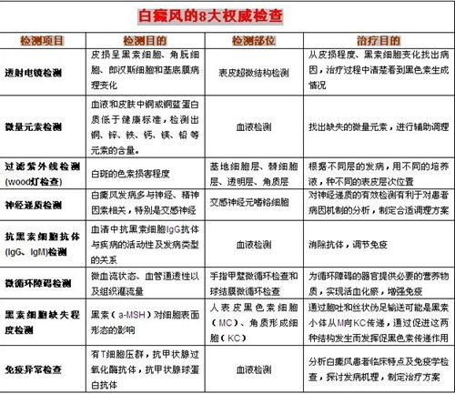 1、全方位检测病因,对症下药。八大检测项目不但能查清白癜风病因,还可对白癜风进行定性和定量分析,为后期白癜风的治疗提供更科学、更精准的临床依据,实行个性化的药物和治疗项目,治疗更具针对性,效果更确切。