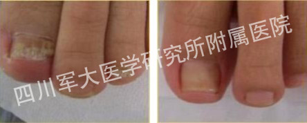 四川军大医学研究所附属医院研究表明:运用四川军大医师技术“中医渗透软化疗法”中药快速深入甲板,深层杀灭潜伏在甲根中的真菌群,修复患者甲床组织。增厚指甲变薄,灰白色,褐色渐渐消退,新甲不断从甲根生长而出,最终将陈旧的病甲全部顶掉,绿色安全、愈后不复发,告别灰指甲。