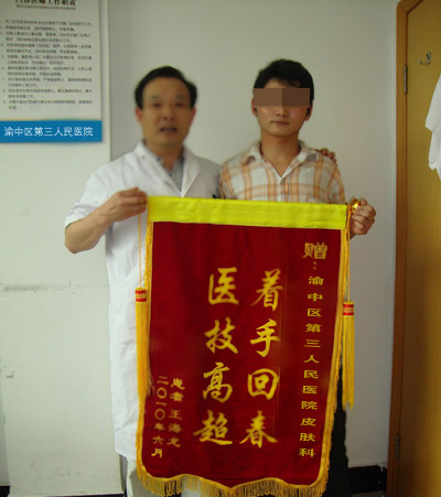 今年6月,在四川军大,小王向众人展示了康复后的体貌:原来遍布浑身的蛇皮状鳞片荡然无存,脸部、手臂、大腿、前胸、后腰的皮肤光滑细嫩,汗毛孔清晰可见排汗通畅,令他最为难捺的奇痒也消失了。如此短期便获如此治疗效果,小王非常满意开心,为表达自己的一片感激之心,特地定制一面锦旗送给医师。