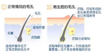 油光满面,油脂过多→毛孔粗大/堵塞→皮脂腺分泌油脂→角质层增厚,油脂渐渐皮层表面隆起→角质层隆起,油脂堵塞毛孔,隆起顶点氧化变成黑色→细菌在毛孔里和油脂搅和在一起→青春痘丙酸杆菌在缺氧情况下大量繁殖→导致炎症细菌侵入,变成脓疱、结节→整个毛囊变红、发炎→细菌扩散到附近的皮肤组织,变得更大,进而形成青春痘。