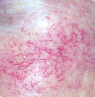 红血丝是面部毛细血管扩张性能差、角质层受损或一部分毛细血管位置表浅引起的面部现象,一丝丝纵横交错,如蜘蛛网般,分散性分布,严重者会连成片状,变成红脸,这种皮肤薄而敏感,过冷、过热、情绪激动、温度突然变化时脸色更红。长期持续的毛细血管扩张就会出现红血丝,你可以看到脸颊,特别是鼻翼两侧有树枝状的红血丝,这就是扩张的毛细血管。在红血丝的基础上,会发出很多看起来像青春痘的丘疹、脓疱,到了晚期鼻子部位的皮脂腺肥大,鼻子变形,这就是酒渣鼻。
