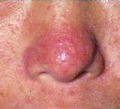 3.鼻赘期:病期欠者,鼻部可出现多个结节,互相融合,表面凹凸不平,鼻部肥大,毛孔明显扩大,毛细血管显著扩张,纵横交错,形成鼻赘。