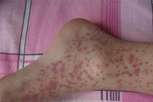 1、患者的皮疹呈出血性和对称性分布红色斑点状,常分布于双下肢,以踝、膝关节周围多见,也可见于臀部及上肢。