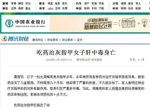 四十多岁的周梅英多年前患上了灰指甲,一直没得到根治,周梅英嫌不美观。多年来,她尝试了很多办法来治疗自己的灰指甲,可效果都一般。去年上半年,周梅英 听人说有一种药对治疗灰指甲很有效果,便到江宁一家药店购买。可吃了几个月后,灰指甲的病情有所好转,但她的身体却变差了,脸色蜡黄,别人都说她肝出问题 了。