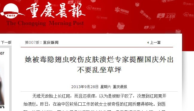 四川军大医学研究所附属医院医师还提醒市民,到郊外时不可乱坐草坪,因为除了毒隐翅虫外,还会有毒毛虫的侵扰,如果皮肤出现展现,应及早到正规皮肤病医院作检查治疗。