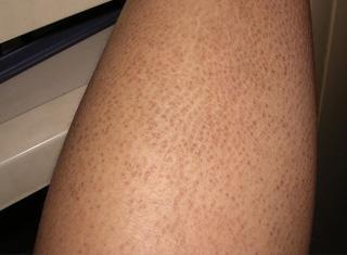 2、鸡皮肤的发生率高,主要好发於上手臂外侧面、大腿伸侧面,严重时,甚至连手肘外侧面、小腿伸侧面都会有,看起来会像是有角质堆积在毛囊开口的现象,厉害时还会有周围发红或肿胀的现象,而让人误会以为自己的手臂或是大腿长了许多粉刺和发炎痘痘。